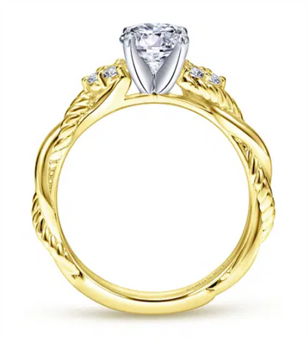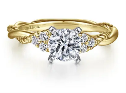 Gabriel & Co Lady's Two-Tone 14 Karat Yellow/White Gold Twisted Rope Diamond Cluster Engagement Ring Mounting, Size 6.5, 6 = 0.13tw Round G/H SI1/SI2 Diamonds, Gram Weight: 2.84, For 0.75CT/5.75mm Round Center Stone