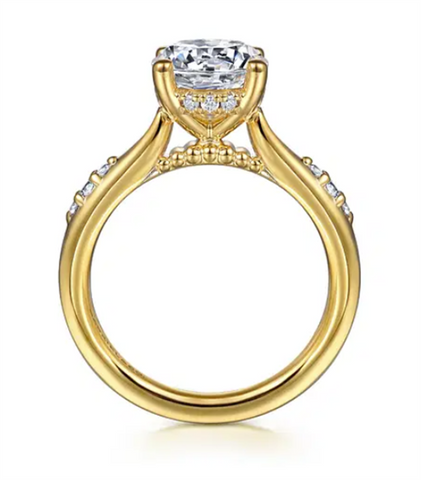 Gabriel & Co Lady's 14 Karat Yellow Gold Hidden Halo Beaded Accent Engagement Ring Mounting, Size 6.5, 18 = 0.15tw Round G/H SI1/SI2 Diamonds, Gram Weight: 4.08, For 2CT/8mm Round Center Stone