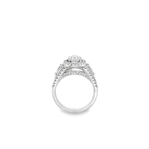 Estate 18 Karat White Gold Simon G Oval Halo Engagement Ring Estate Jewelry Size 5.5 With One = 1.75Ct Oval F I1 Diamond, 2 = 0.44Tw Pear F Si2 Diamonds And 0.37 Twt Other Stones Gram Weight: 7