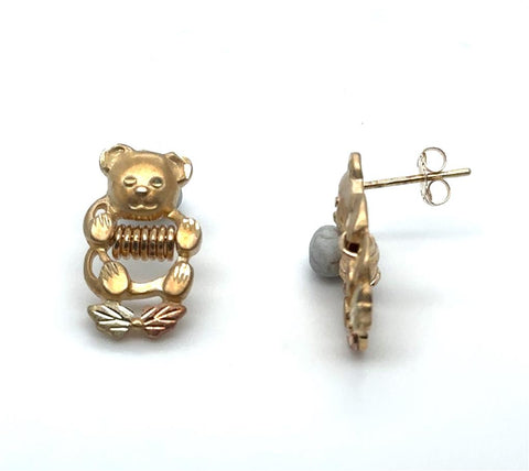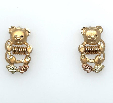 Tri-Color 10 Karat Diamond Cut/Satin Black Hills Gold Bear Stud Earrings With Rings Estate Jewelry Gram Weight: 2.7