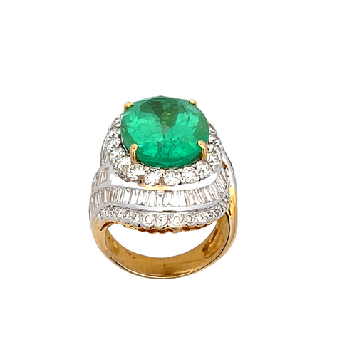 Estate 18 Karat Yellow Gold Oval Emerald and Baguette & Round Diamond Bypass Halo Ring, Size 7, With One = 9.87Ct Oval Emerald, 58 = 1.58Tw Round H/I Si1/Si2 Diamonds And 1.85 Twt Other Stones, Gram Weight: 14.41