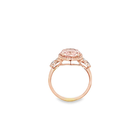Estate 14 Karat Rose Gold Morganite and Diamond Halo Ring, Size 7.25,One = 11.00X9.00mm Oval Morganite And 58 = 0.58TW Round Diamonds, Gram Weight: 3.54