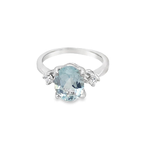 Estate 14 Karat White Gold 3 Stone Aquamarine and Diamond Ring, Size 4 With One = 8.93X6.90mm Oval Aqua And 2 = 0.12TW Round Diamonds, Gram Weight: 2.67